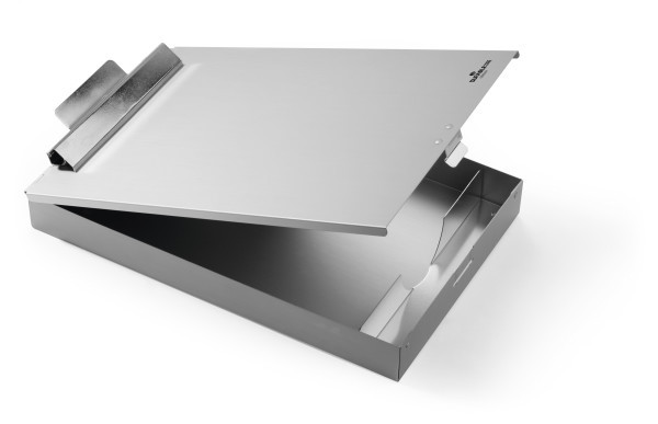 CLIPBOARD z szerokim klipsem, idealny na dokumenty w formacie A4. Pod CLIPBOARD-dem pojemnik na zawiasach, do przechowywania dokumentów. Z recyklingowanego aluminium pokrytego bezbarwnym lakierem .