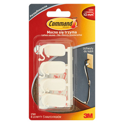 Średnie uchwyty do kabli Command trzymają się mocno takich powierzchni jak drewno, pomalowane ściany, płytki ceramiczne itp. Można je w prosty sposób mocować i usuwać. Nie trzeba wiercić dziur w ścianach, nie pozostawiają śladów lub resztek kleju. Po przemeblowaniu wnętrza wystarczy zastosować paski uzupełniające, by ponownie ich użyć.