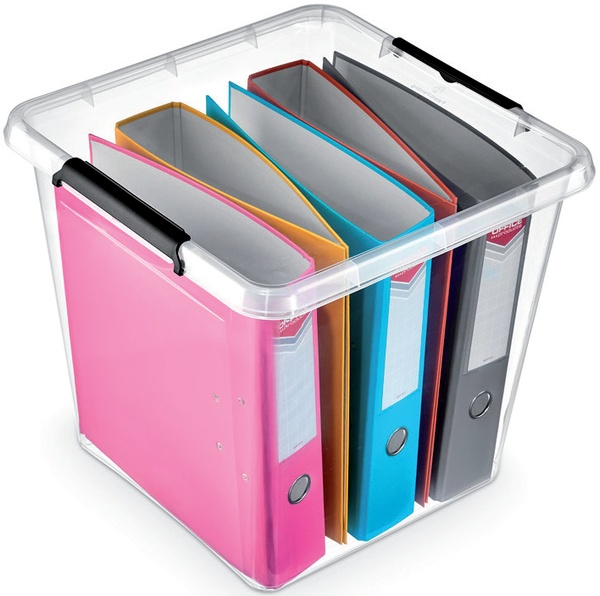 Uniwersalny pojemnik do przechowywania, który dzięki swoim wymiarom znakomicie sprawdzi się jako pojemnik na segregatory. Ochroni dodatkowo wszystkie dokumenty zarówno przed kurzem jak i niechcianym zamoczeniem. To doskonałe rozwiązanie wszędzie tam gdzie chcemy aby nasze dokumenty były bezpieczne. Praktyczne klipsy szczelnie zamykają pojemnik, a ich specjalna konstrukcja pozwala na uchylenie pokrywy po otwarciu tylko jednego klipsa z dowolnej strony.