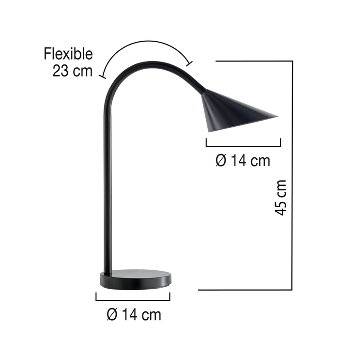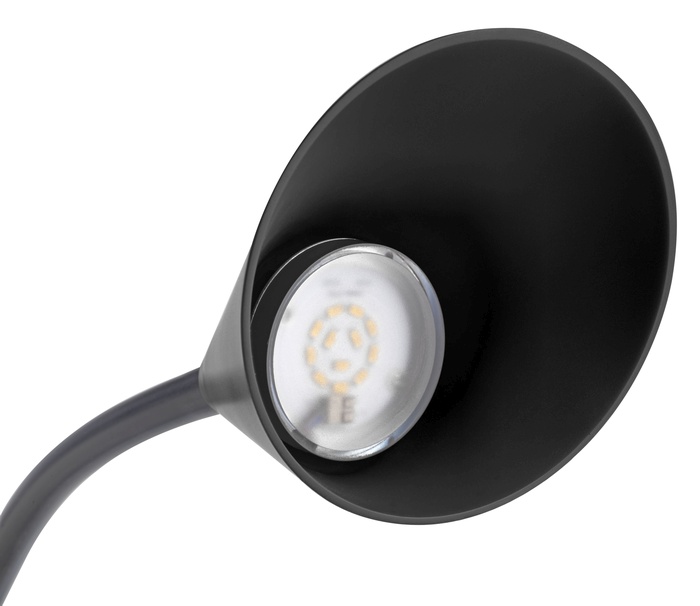 Czarna lampka biurkowa wyposażona w zintegrowaną diodę LED o bardzo wysokiej jakości oświetlenia. Kształt klosza zapewnia lepszą dyfuzję swiatła. Elastyczne ramię umożliwia szeroki zakres ruchów. Włącznik umieszczony na kablu.