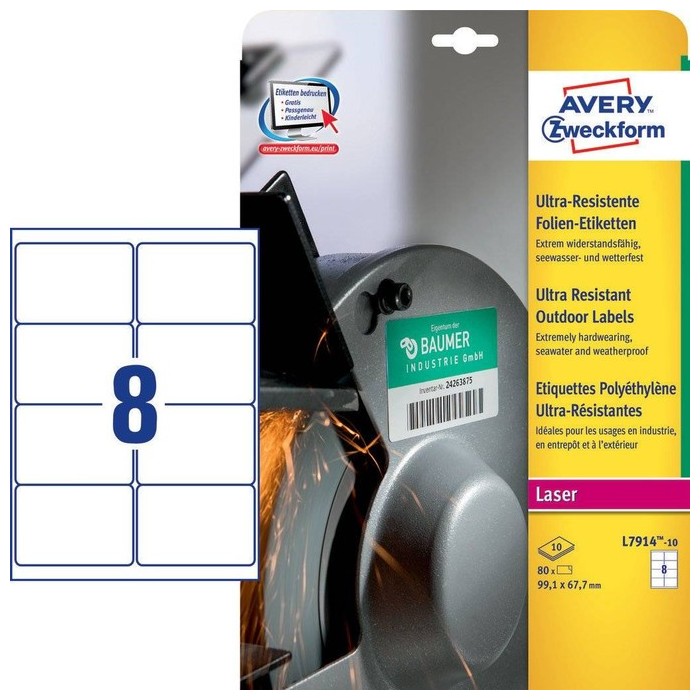 Białe etykiety Ultra Resistant - ultra wytrzymałe Avery Zweckform L7914-10 w rozmiarze 99,1 x 67,7 mm są niezwykle wytrzymałe i nadają się do trwałej aplikacji zarówno wewnątrz, jak i na zewnątrz. Rozciągliwe etykiety polietylenowe, 10 arkuszy w opakowaniu. Dzięki silnemu przyleganiu nawet na trudnych powierzchniach idealnie nadają się do oznaczania na produkcjach, w magazynach oraz do etykietowania kontenerów. Odporne na pogodę, promienie UV, wodę morską, temperaturę (-40°C do +150°C). Poza tym, są odporne na działanie rozpuszczalników, środków czyszczących, zabrudzenia i są zmywalne. Projektuj i drukuj etykiety w łatwy i szybki sposób - za pomocą bezpłatnych szablonów i oprogramowania online od Avery Zweckform. Odpowiednie do wszystkich standardowych drukarek laserowych.
