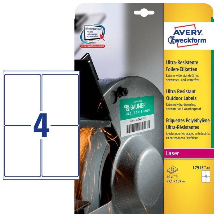 Białe etykiety Ultra Resistant - ultra wytrzymałe Avery Zweckform L7915-10 w rozmiarze 99,1 x 139 mm są niezwykle wytrzymałe i nadają się do trwałej aplikacji zarówno wewnątrz, jak i na zewnątrz. Rozciągliwe etykiety polietylenowe, 10 arkuszy w opakowaniu. Dzięki silnemu przyleganiu nawet na trudnych powierzchniach idealnie nadają się do oznaczania na produkcjach, w magazynach oraz do etykietowania kontenerów. Odporne na pogodę, promienie UV, wodę morską, temperaturę (-40°C do +150°C). Poza tym, są odporne na działanie rozpuszczalników, środków czyszczących, zabrudzenia i są zmywalne. Projektuj i drukuj etykiety w łatwy i szybki sposób - za pomocą bezpłatnych szablonów i oprogramowania online od Avery Zweckform. Odpowiednie do wszystkich standardowych drukarek laserowych.