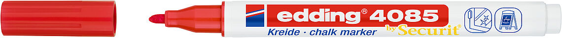 Marker kredowy edding 4085 to niewątpliwie idealny wybór jeśli chodzi o precyzyjne pisanie lub eleganckie rysunki kredą. Posiada drobną, okrągłą końcówkę, która uwalnia świetnie kryjącą, płynną kredę umożliwiając pisanie i znakowanie nawet mniejszych obszarów. Gama 20 kolorów uwalnia nieograniczone możliwości tworzenia na gładkich powierzchniach, takich jak tablice, lustro i szkło. Marker kredowy edding 4085 nadaje się nie tylko do kreatywnej pracy w domu ale jest ulubionym narzędziem firm w branży gastronomicznej (bary, restauracje) a także przemyśle szklarskim.
