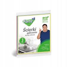 Ściereczki gąbczaste marki Forte+ ze względu na swoją budowę są niezwykle chłonne i bardzo wytrzymałe. Mogą być stosowane we wszelkich pracach domowych wykonywanych w kuchni, łazience czy innych pomieszczeniach. Specjalna struktura zapewnia szybkie schnięcie ścierki, dzięki czemu nie wydziela ona przykrego zapachu. Przed i po każdym użyciem ścierek należy wypłukać je w ciepłej, bieżącej wodzie. Suche ściereczki odzyskują swoje właściwości po zwilżeniu. Głównym składnikiem ścierek jest celuloza, surowiec w 100% naturalny, który ulega biodegradacji.