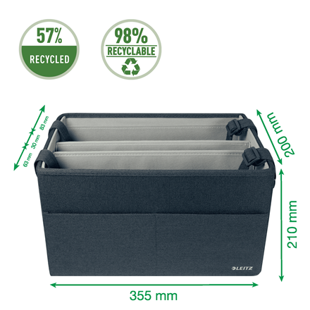 Dzięki produktom z kolekcji Leitz Fabric poczujesz się jak w domu wszędzie tam, gdzie zaprowadzą Cię obowiązki zawodowe. Minimalistyczne wzornictwo oraz eleganckie matowe wykończenie w kolorze ciemnoszarym pozwolą Ci zachować zarówno styl, jak i porządek w biurze, w domu, kiedy pracujesz hybrydowo lub przemieszczasz się między różnymi lokalizacjami. Kompaktowa torba na akcesoria Leitz Fabric, do pracy przy ?gorących biurkach? posiada trzy oddzielne przegrody, które umożliwiają przechowywanie i przenoszenie wszystkiego, co może być Ci potrzebne w nadchodzącym dniu. Ta nowoczesna i praktyczna torba do przechowywania pomieści laptopa o przekątnej do 14 cali, kompaktową klawiaturę, mysz, kabel do ładowania, zestaw słuchawkowy, notatnik i butelkę na wodę. Mieści się w szafkach o minimalnych wymiarach 370 x 210 mm i wysokości 220 mm. Nadaje się również jako torba dla nauczyciela. Wykonana jest z miękkiej tkaniny wzmocnionej tekturą pochodzącą z recyklingu, która zwiększa jej trwałość i wytrzymałość. Materiały pochodzące z recyklingu stanowią 57%. Torbę można złożyć, dzięki czemu jest łatwa do przechowywania, gdy nie jest używana. Posiada zawieszkę imienną, która ułatwia odszukanie torby w przestrzeniach wspólnych. Torba na akcesoria do pracy przy ?gorących biurkach? z regulowanymi uchwytami do przenoszenia idealnie sprawdzi się w domu, w biurze lub w szkole - pomoże Ci być produktywnym i zrelaksowanym przez cały dzień.