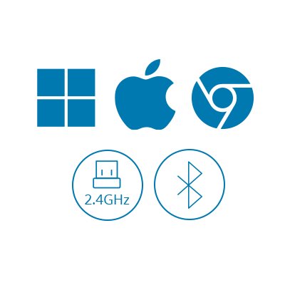 - Możliwość połączenia do 3 aktywnych urządzeń: dwóch za pomocą łączności Bluetooth? Low Energy (LE) oraz jednego za pośrednictwem dołączonego adaptera 2,4 GHz USB-A.