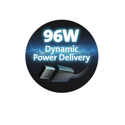 - Obsługuje Power Delivery do 96 W i automatycznie ustawia optymalną wydajność